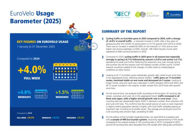 The latest EuroVelo Usage Barometer for 2025, published in collaboration with Eco-Counter, confirms that cycling traffic on EuroVelo grew compared to 2024, with a significant overall increase of +4.0%. This marks a renewed upturn after a few years of plateauing in the wake of the COVID-19 cycling boom. While weekend traffic increased modestly (+1.5%), weekday cycling saw a more substantial rise (+4.8%), suggesting growing use of EuroVelo routes for daily mobility purposes.